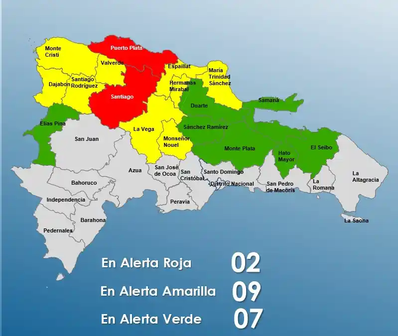 - 🟢 Alerta Verde: Samaná, Duarte, Elías Piña, Hato Mayor, El Seibo, Monte Plata, Dajabón.