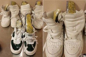 Los agentes rompieron los pares de tenis, hallando un polvo marrón que dio positivo en la prueba de heroína.