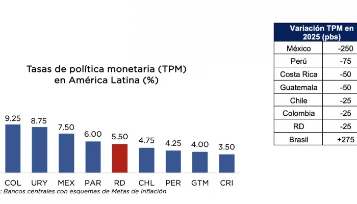 Con 5.50 %, la tasa del BCRD se ubica en niveles intermedios respecto a la región: más baja que en economías con mayor inflación, pero por encima de países con políticas monetarias más expansivas.