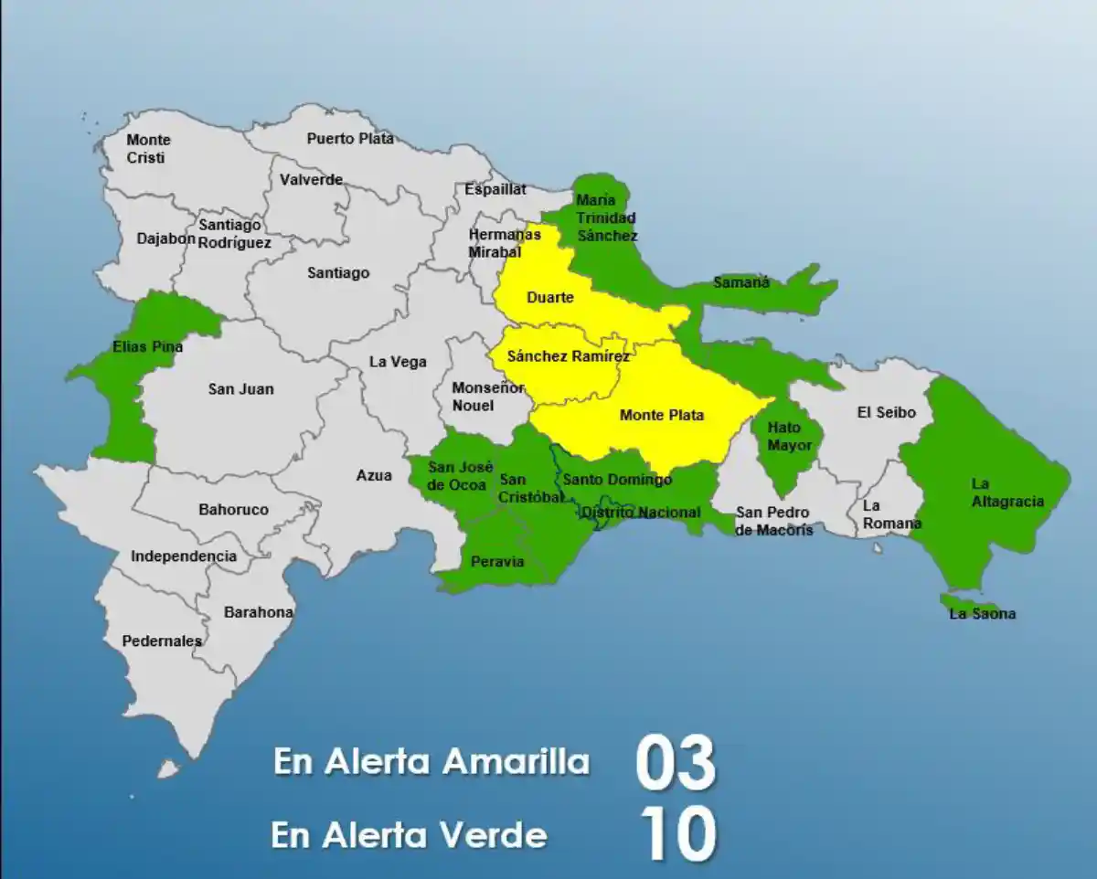 El boletín advierte sobre el riesgo inminente de crecidas de ríos, arroyos y cañadas, así como inundaciones urbanas o repentinas, por lo que el COE declaró alerta amarilla para tres provincias y el Distrito Nacional, mientras que diez provincias permanecen en alerta verde.