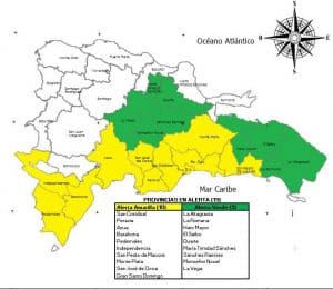Mientras, que en alerta verde continúan las provincias La Altagracia, La Romana, San Pedro de Macoris, Hato Mayor, El Seibo, Duarte, Maria Trinidad Sánchez, Sánchez Ramírez, Monseñor Nouel y La Vega.