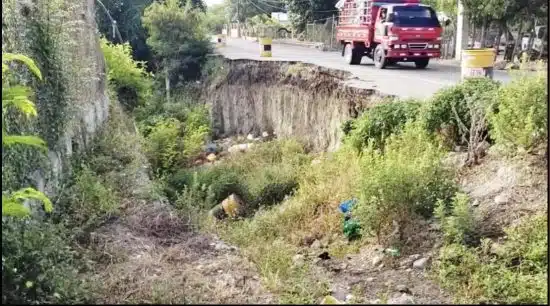 El desprendimiento de parte de la carretera abarca una tercera parte de uno de los carriles, por lo que los vehículos son desplazados prácticamente al borde del precipicio.