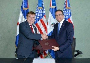 SANTO DOMINGO.-  El ministro de Relaciones Exteriores, arquitecto Andrés Navarro, y el embajador de los Estados Unidos, James Brewster, firmaron un acuerdo que incrementa en unos 13 millones de dólares la cooperación para fortalecer las instituciones que trabajan en la seguridad ciudadana, las unidades anti lavado, la sana aplicación de las leyes y en el combate contra narcotráfico y la corrupción administrativa.