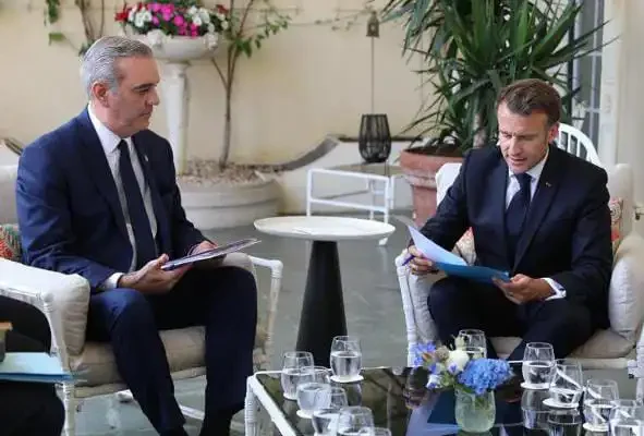 Los presidentes Emmanuel Macron y Luis Abinader se reunieron en Francia para tratar temas clave como el financiamiento del tren metropolitano, la crisis haitiana y el combate al sargazo.
