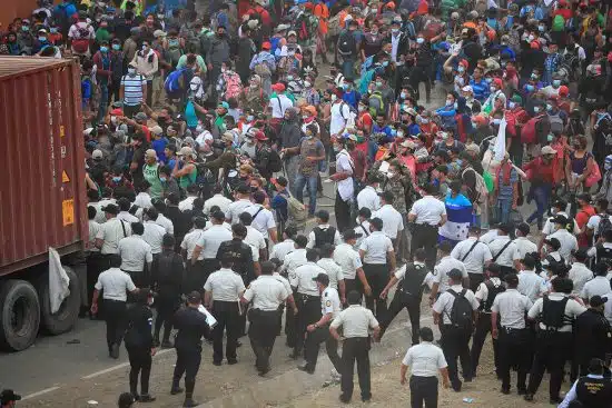 Las autoridades del Instituto Guatemalteco de Migración dijeron a los periodistas que habían tratado de dialogar con los migrantes para que despejaran la vía, en la que se había generado una fila de vehículos de 30 kilómetros, principalmente vehículos de carga.
