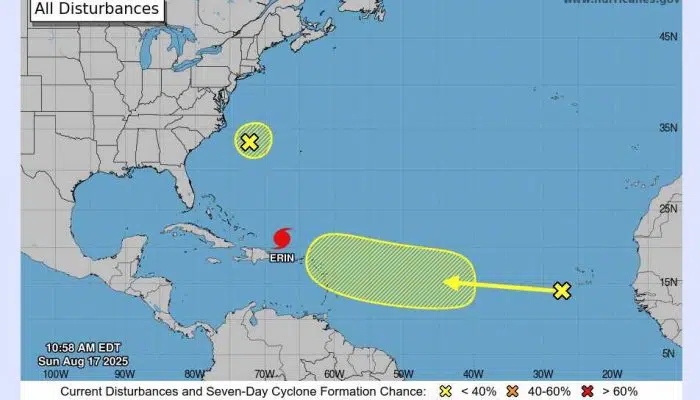 A las 11:00 AM AST (15:00 UTC) del domingo 17 de agosto de 2025, el Centro Nacional de Huracanes (NHC) informó que el huracán Erin se encontraba en categoría 3, con vientos sostenidos de 125 mph (205 km/h) y una presión central de 946 mb. El sistema se localizaba aproximadamente a 320 km al NNO de San Juan, Puerto Rico, y 385 km al este de la isla Gran Turk.
