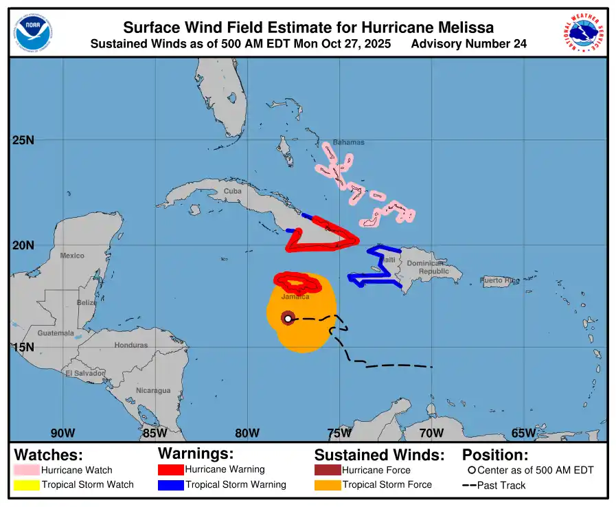 - Lunes y martes: Melissa se moverá sobre Jamaica, provocando lluvias de 15 a 30 pulgadas (hasta 40 en zonas aisladas).