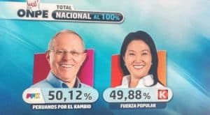 De acuerdo con los resultados oficiales, Kuczynski obtuvo el apoyo del 50,12% de los votantes. Su rival Keiko Fujimori, la hija del encarcelado expresidente Alberto Fujimori, recibió el 49,88% de los votos.