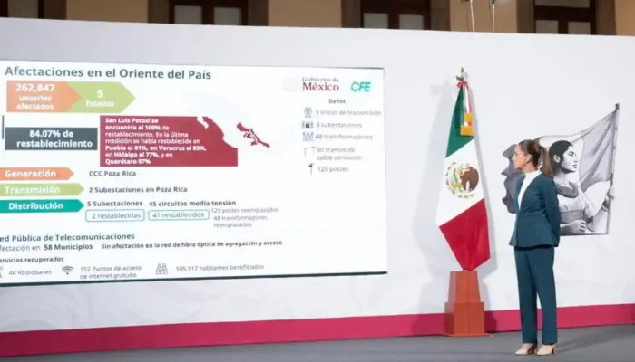 CIUDAD DE MEXICO, 13 octubre, 2025 (Xinhua) — Imagen proveída por la Presidencia de México de la presidenta mexicana, Claudia Sheinbaum, participando durante su conferencia de prensa matutina, en Palacio Nacional, en la Ciudad de México, capital de México, el 13 de octubre de 2025. A 64 aumentó el número de personas fallecidas en México por las lluvias e inundaciones registradas entre el 6 y el 9 de octubre pasado en los estados de Veracruz, Puebla, Hidalgo y San Luis Potosí, consideradas las más intensas del año en esa región del país, informaron el lunes las autoridades. (Xinhua/Presidencia de México)