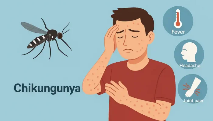 Entre los síntomas más frecuentes se encuentran fiebre alta, dolor articular intenso, cefalea, fatiga, náuseas y erupciones cutáneas. La enfermedad, de muy baja mortalidad, suele tener un curso benigno y su tratamiento es únicamente sintomático.
