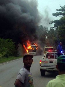 SANTIAGO.-Al menos seis personas fallecieron la tarde de este domingo, entre ellos una niña de cuatro años y otras 12 resultaron heridas cuando un autobús de pasajeros en el que se trasladaban impactó contra un poste del tendido eléctrico y se incendió en un hecho que ocurrió en la carretera que comunica Sánchez con Nagua.
