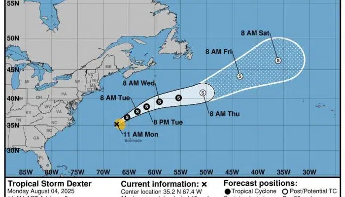 SANTO DOMINGO. – La tormenta tropical Dexter, tercera del Atlántico en 2025, continúa su desplazamiento al noreste alejándose de la costa este de Estados Unidos, sin representar ningún peligro para tierra firme, informó este lunes 4 de agosto el Centro Nacional de Huracanes (NHC) con sede en Miami.