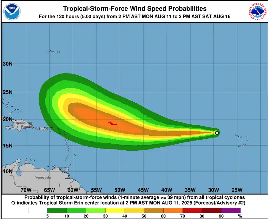 SANTIAGO – El Centro Nacional de Huracanes (NHC, por sus siglas en inglés) informó este lunes 11 de agosto de 2025 que la tormenta tropical Erin, localizada a 690 kilómetros al oeste de las islas de Cabo Verde, mantiene vientos máximos sostenidos de 75 km/h y continúa desplazándose hacia el oeste a 33 km/h.