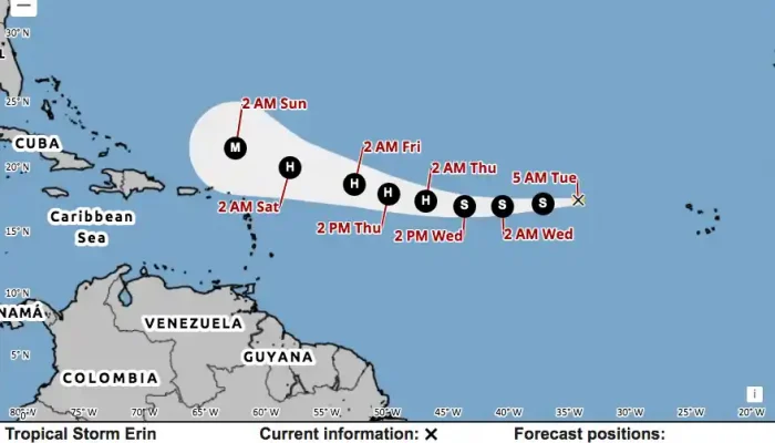 Según el NHC, se prevé un fortalecimiento gradual en las próximas 48 horas, con alta probabilidad de que Erin alcance categoría de huracán antes de finalizar la semana.